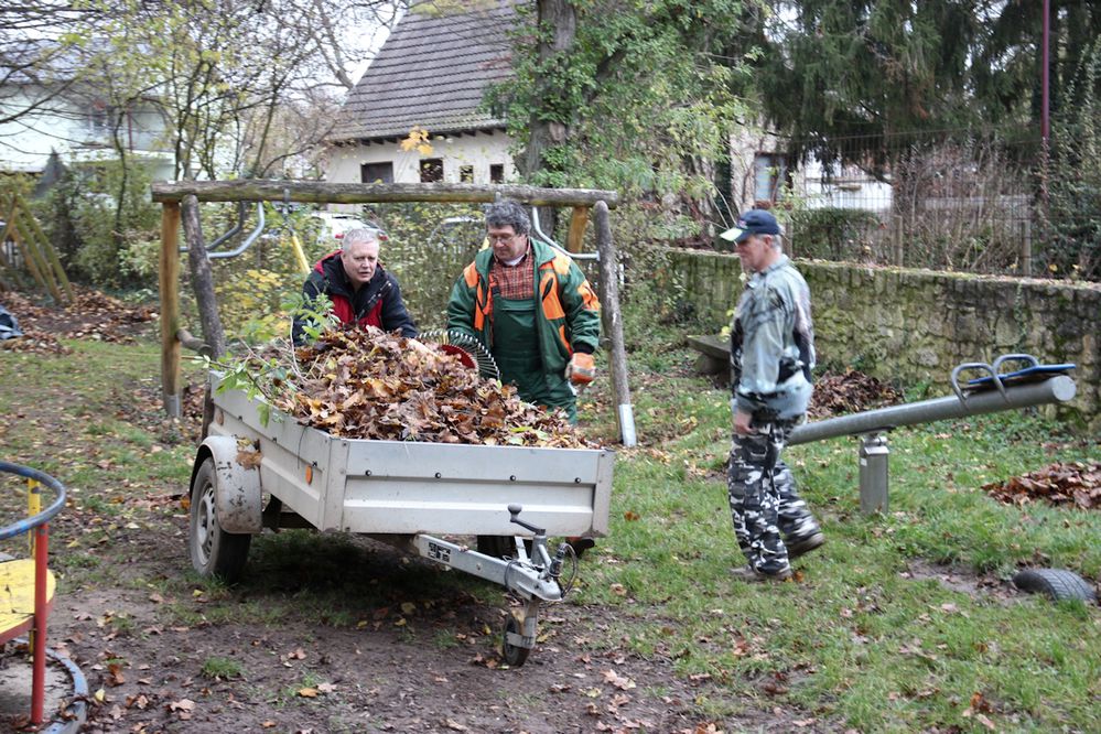 (29.11.2014). Mehrere große Anhängerladungen voll Laub, dörren Ästen und Grünschnitt sind das Ergebnis einer „Herbstputz-Aktion“ der SPD Eppelsheim am vergangenen Samstag auf dem Kinderspielplatz am Effenkranz.